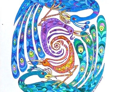 My drawing juried into the show is titled Celtic Peacocks, pen and colored pencil, 14″ x 18″ matted and framed. It is done in the style of the Book of Kells, and consists of intricate, meticulous knots and bright colors reminiscent of the work done by ancient Irish monks in their stone towers.
